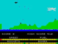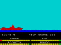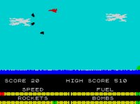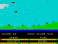 Your mission is to fly your harrier over enemy territory to attack and destroy the enemy base and then return safely to your ship. To achieve this you have to take off from the ship and fly to the right over the sea and the enemy positions until you reach the base. You’ll be under constant attack during the flight from enemy aircraft, rockets and ground-to-air missiles, plus flack from anti-aircraft guns. You may attack and destroy enemy targets with either bombs or rockets, but remember to leave enough in reserve to bomb the enemy base and then defend yourself during the return flight. Similarly it is important to leave enough fuel in your tanks to get back to the ship. Flying at about three-quarters speed gives maximum fuel economy. Flying at full speed, hovering or flying backwards burns up fuel rapidly. After bombing the enemy base you must return to the left to get back to your ship, as flying past the base takes you over the jungle.